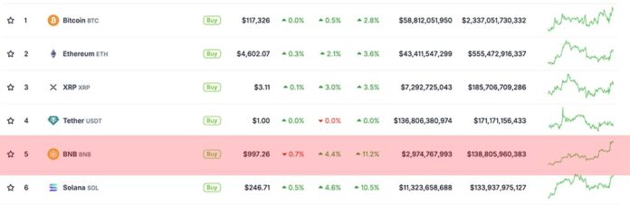 Make no mistake, BNB crypto price rally is a signal. BNB’s current $138B market cap has now edged out Solana’s $134B, according to CoinGecko, reclaiming its #5 spot.
