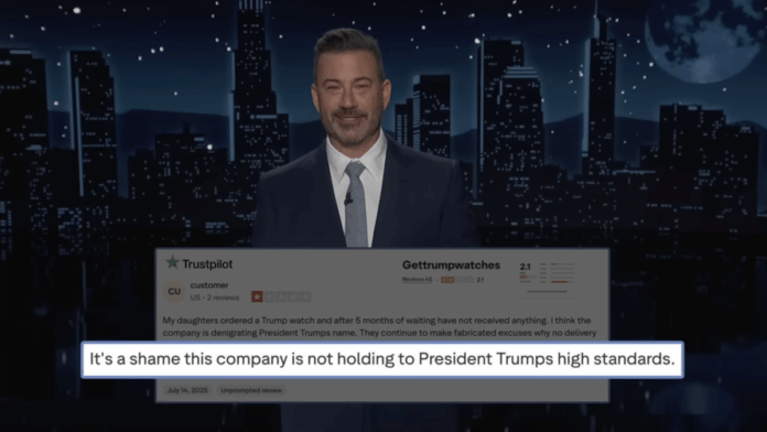 “I have bad news for you honey, they’re holding exactly to Trump’s high standards,” Kimmel says. “Mr made-in-America and his partners claim the watches feature premium, Swiss-made materials, but most of the experts seem to agree they are likely made in China. I hope he gets hit by his own tariffs.”