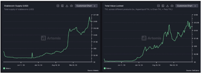 Solana’s total value locked and stablecoin balances keep climbing, signaling steady liquidity growth across the network.