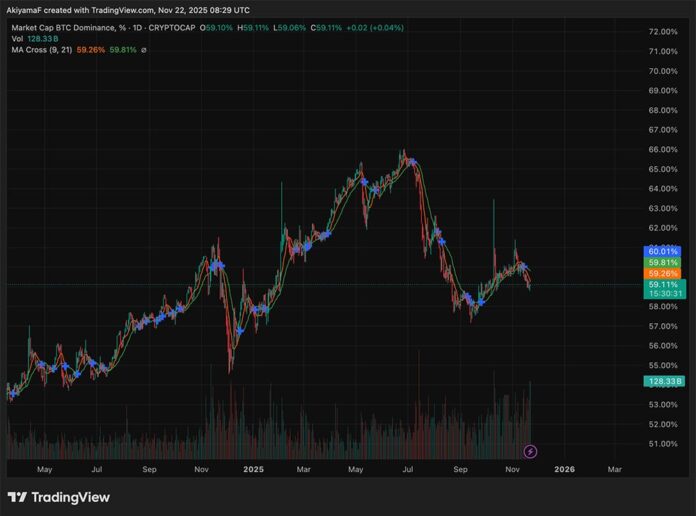 BTC dominance has slipped about 4% and is forming a death cross, which lines up with what we’ve been seeing from altcoins. Other BTC pairs snapped back from their October lows.
