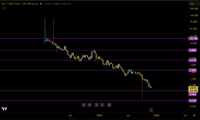 TIA is down -97% from its all-time high of $20.85, reached just three months after its launch in February 2024. It has been a downhill slide ever since, as a lack of innovation and mass adoption of Celestia has led the token to fall from its launch price of $2.3 to its current level of $0.62.