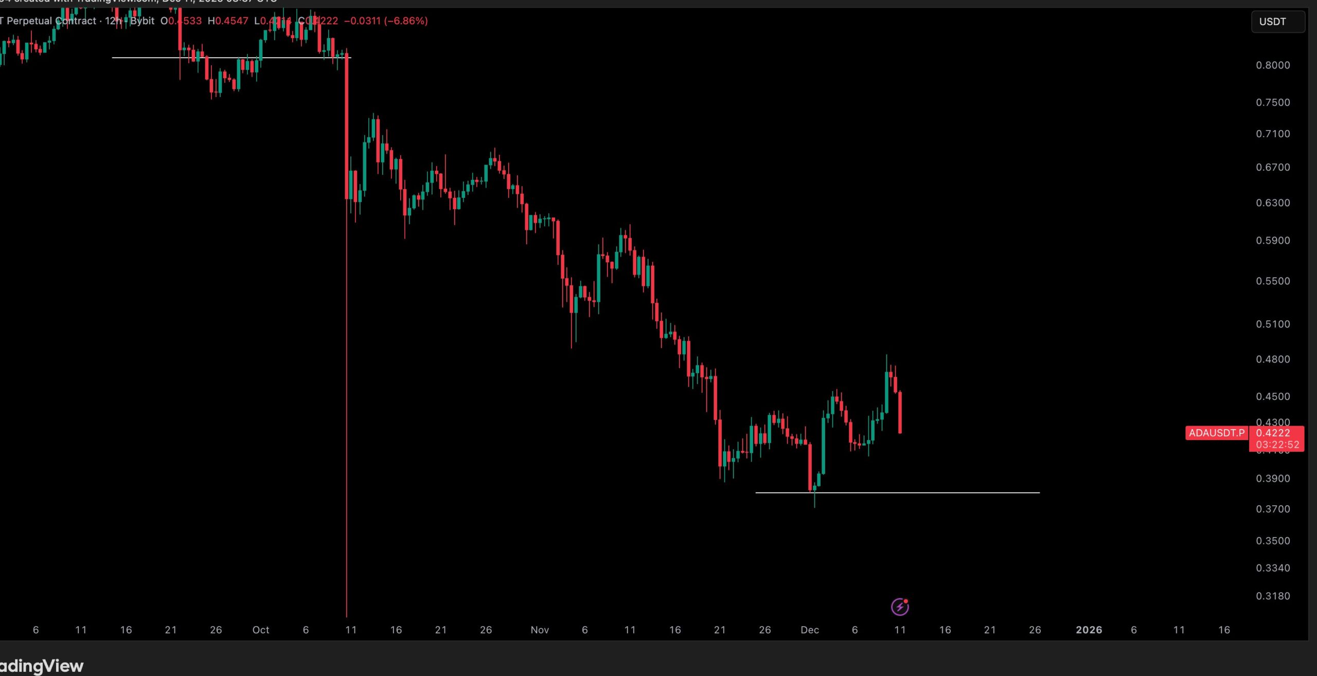 The latest 12-hour candles show a short attempt to recover from the early-December dip near the $0.39 support zone. But the move faded fast. The analyst summed up the mood in a blunt caution: “New lows incoming for ADA.” His view adds to the concern that the market may not be finished sliding yet.