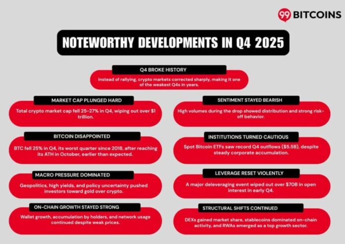 The post Crypto’s “Best Quarter” Didn’t Show Up: Q4 2025 Wiped $1T As Bitcoin Slid And Institutions Split appeared first on 99Bitcoins.