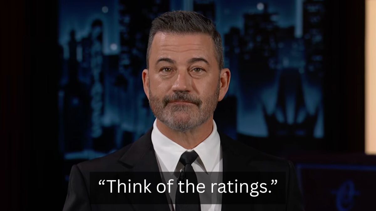 “This feels like a cop-out to me, and I want to address the president directly on this,” says Kimmel, turning to face a side camera. “Mr President, please: Let me host this dinner. I’ve never asked you for anything before. Can you imagine you, me, the commissioner of the FCC, all at a table together? Think of the ratings! I’ll even throw in an award.”